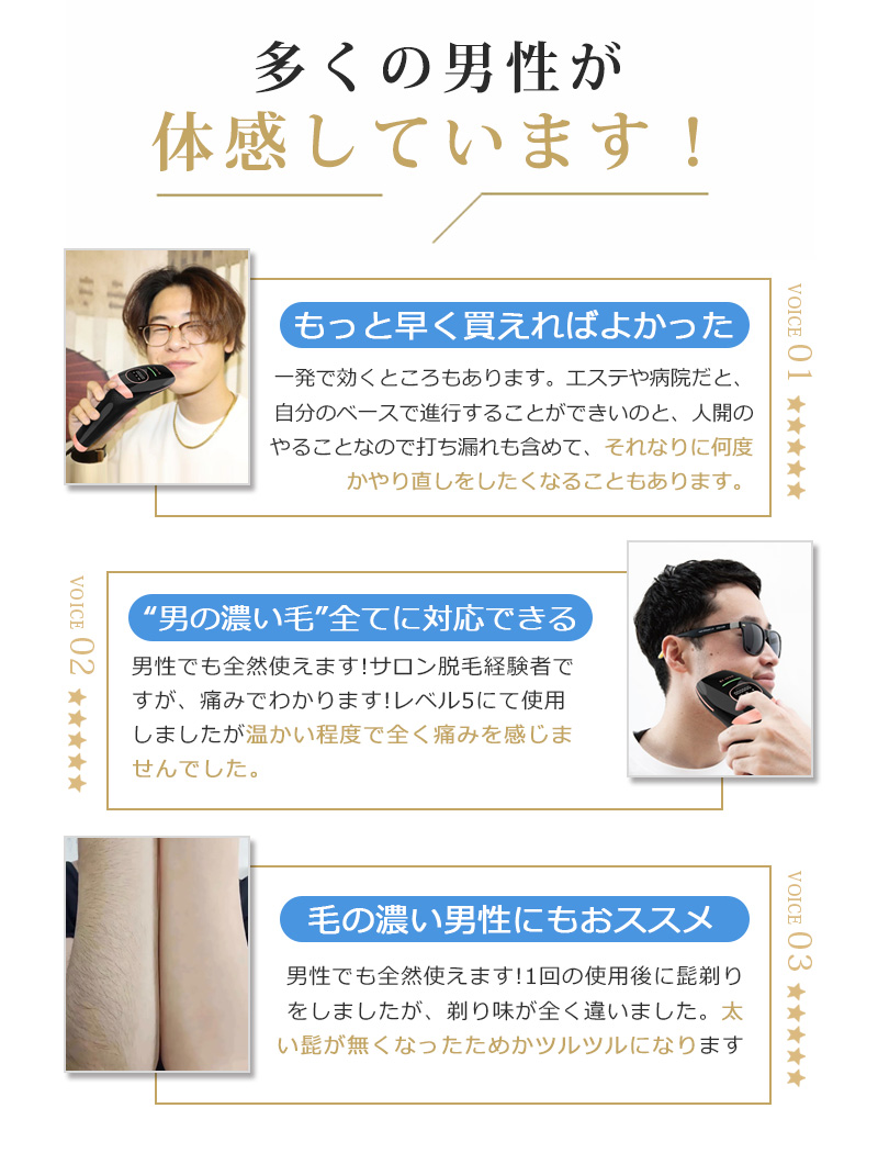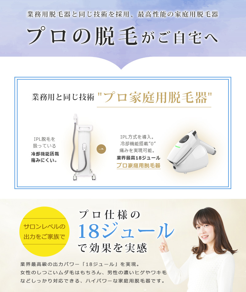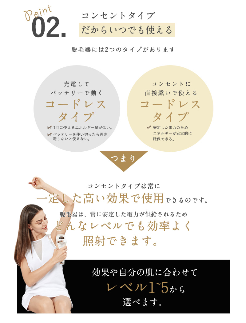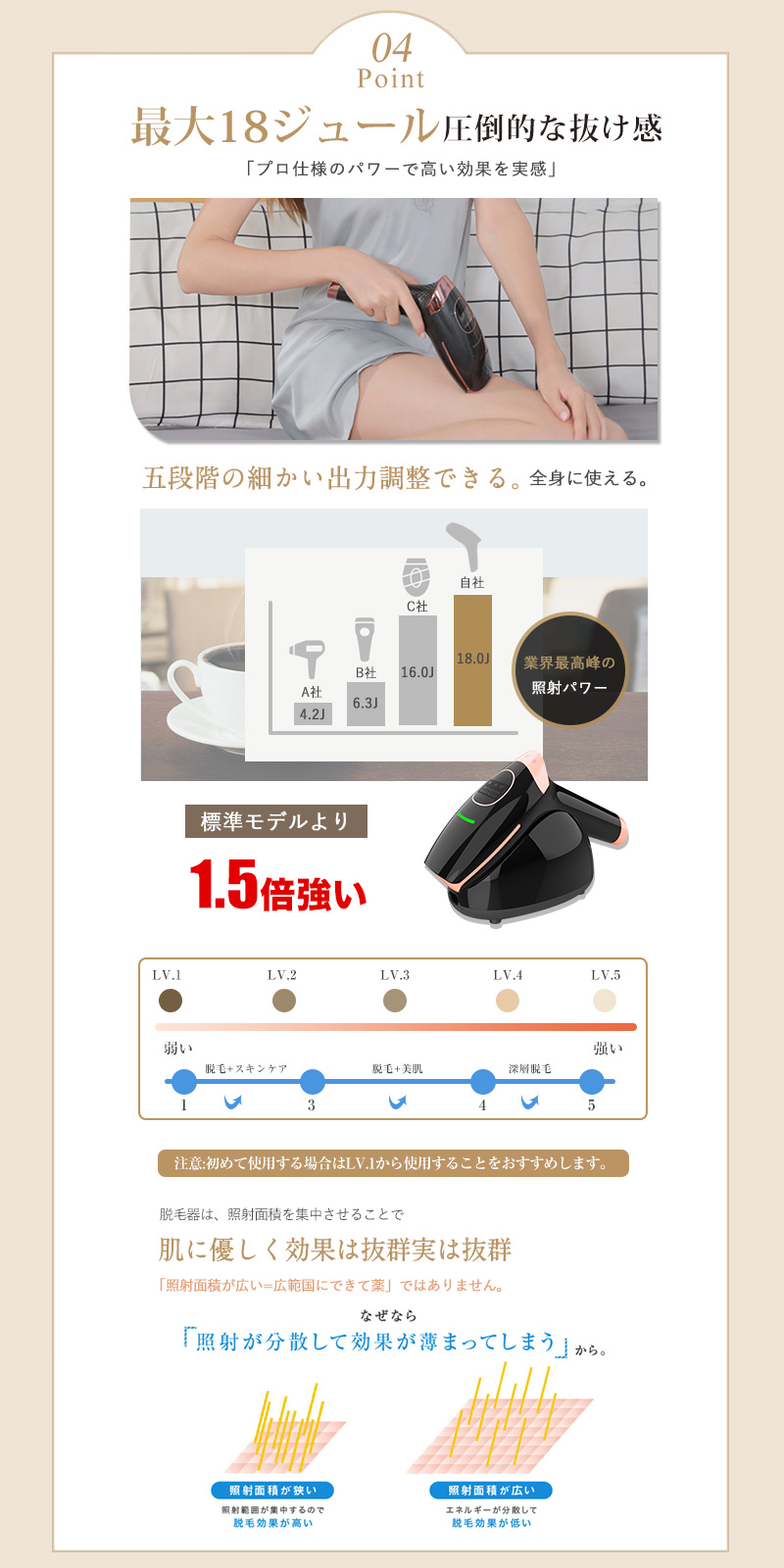 【選べる5段階のパワ一】5段階の細かい出力調整、1照射あたり、17.6ジュール顔やVIOなど全身に使える。脱毛サロン以上の照射パワ一。