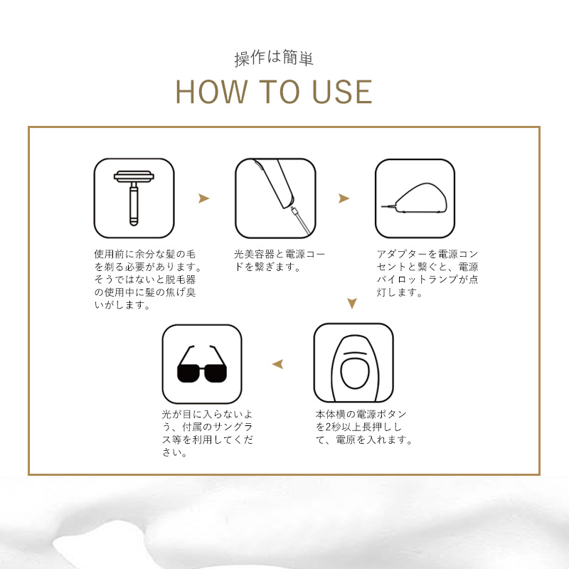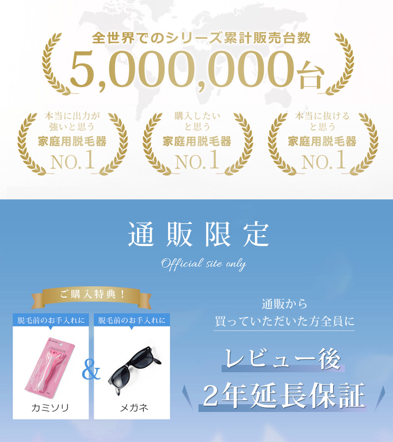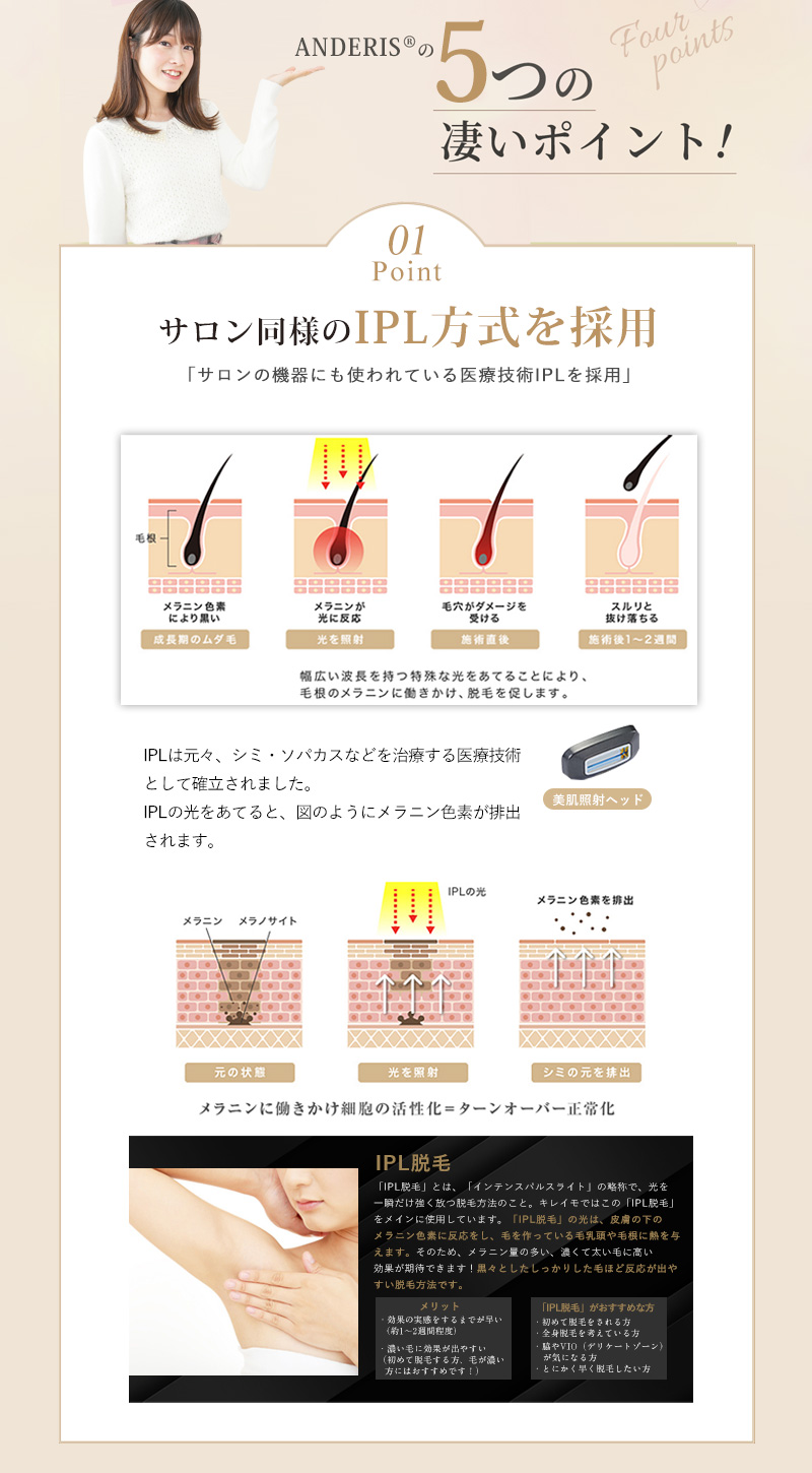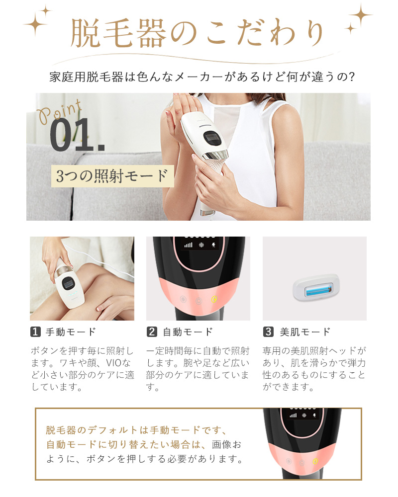 【無制限回照射&5段階の出力レベル】 無制限回の照射回数があり、長期間の使用が可能で全身の脱毛に使用ができます。また、肌質や毛質に合わせて、手動照射と自動連続照射モードがあり、最適なケアが楽しめます。