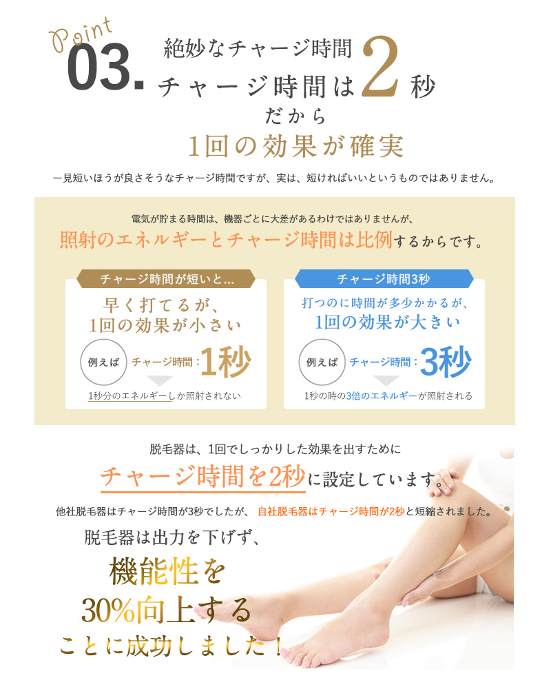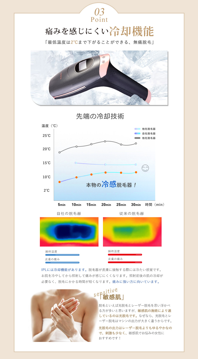 【無痛脱毛】脱毛しながら、肌表面の温度を下げて、何といっても痛み・熱さを非常に感じにくいのでお肌への負担がかからない最新の脱毛器です。不快感や痛伴わない脱毛を実現します。本冷感脱毛器は敏感肌でも安心してご使用いただけます。