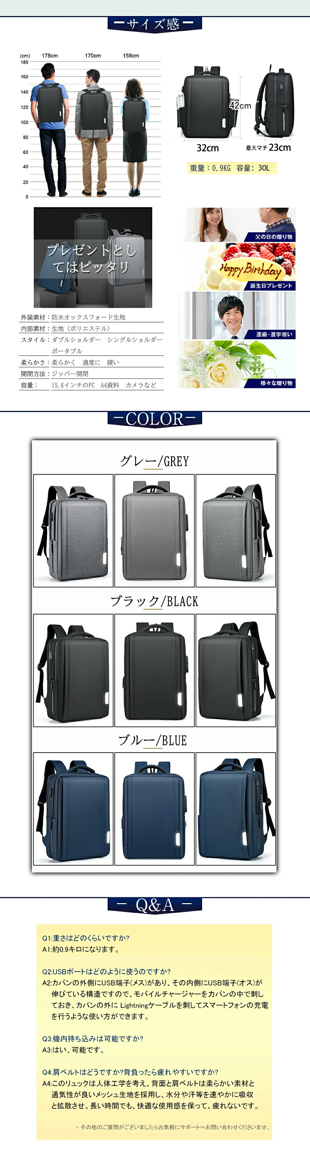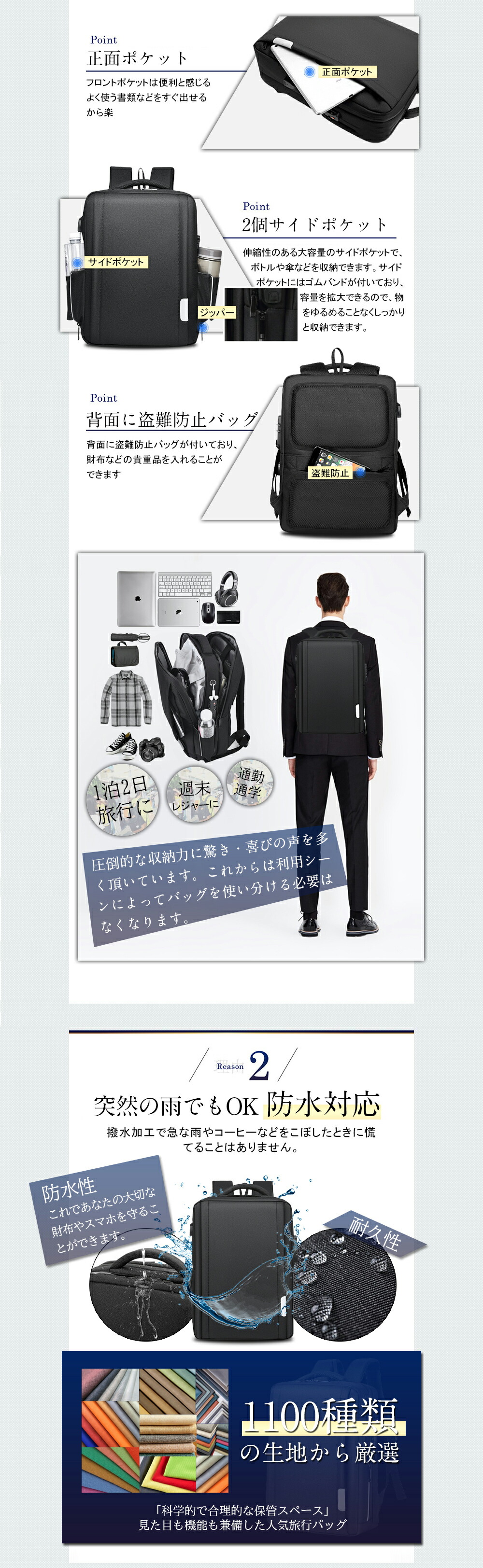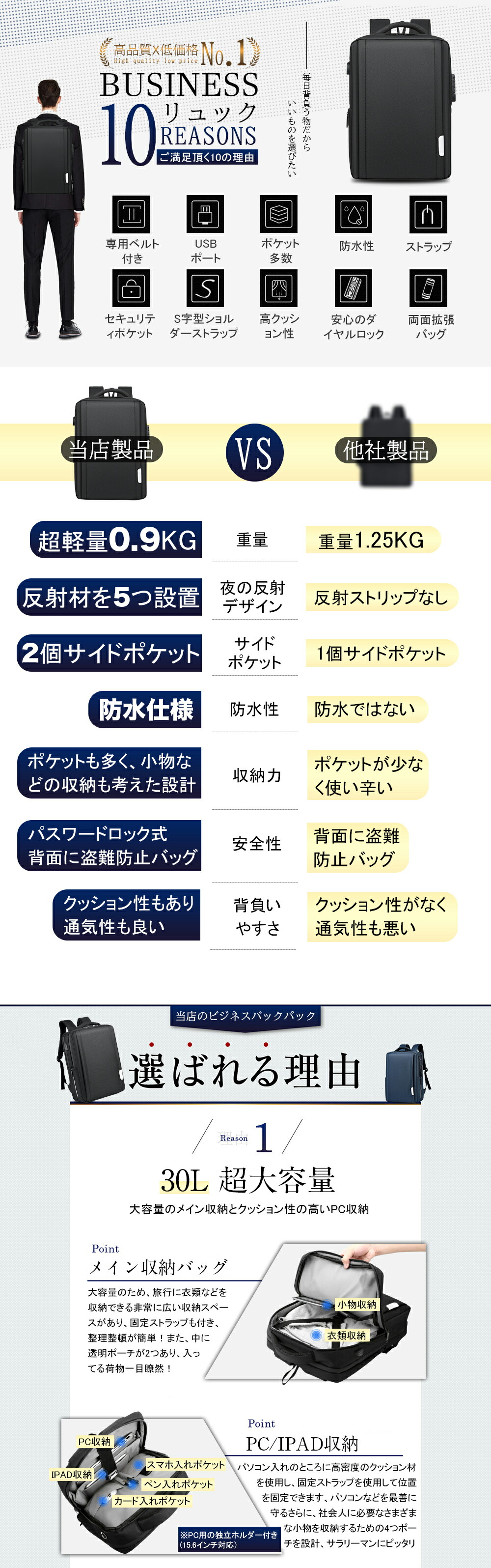 ビジネスリュック 完全防水 大容量 軽量 充電 15.6インチ 防水 ノートpc 30l usbポート 出張 旅行 機内持ち込みサイズ 1895