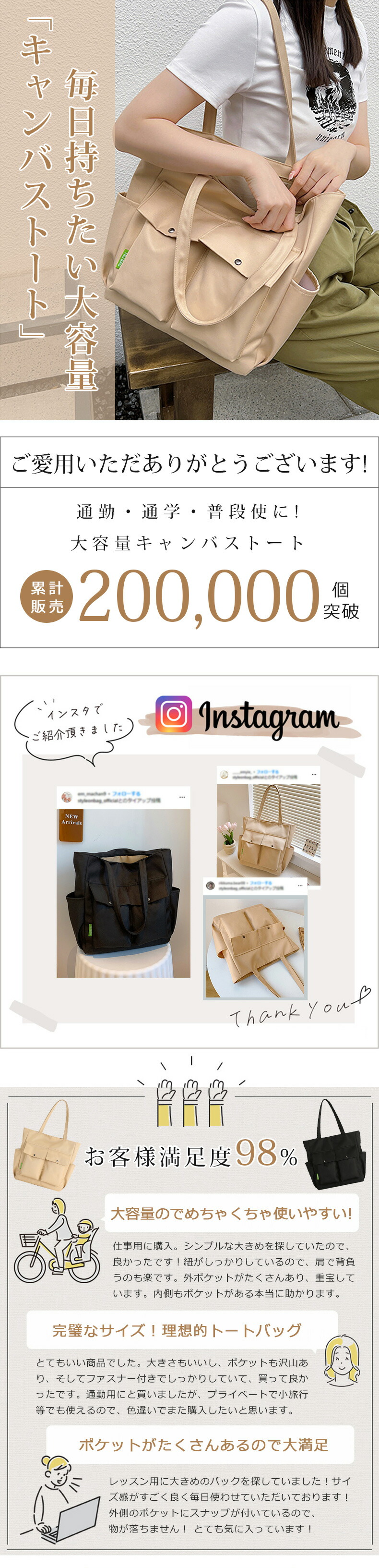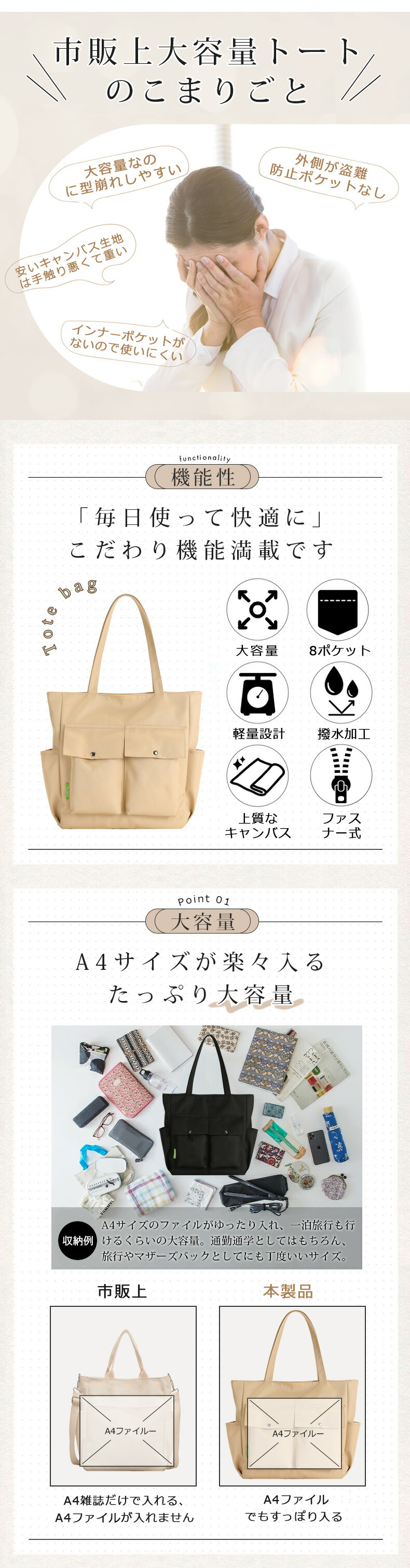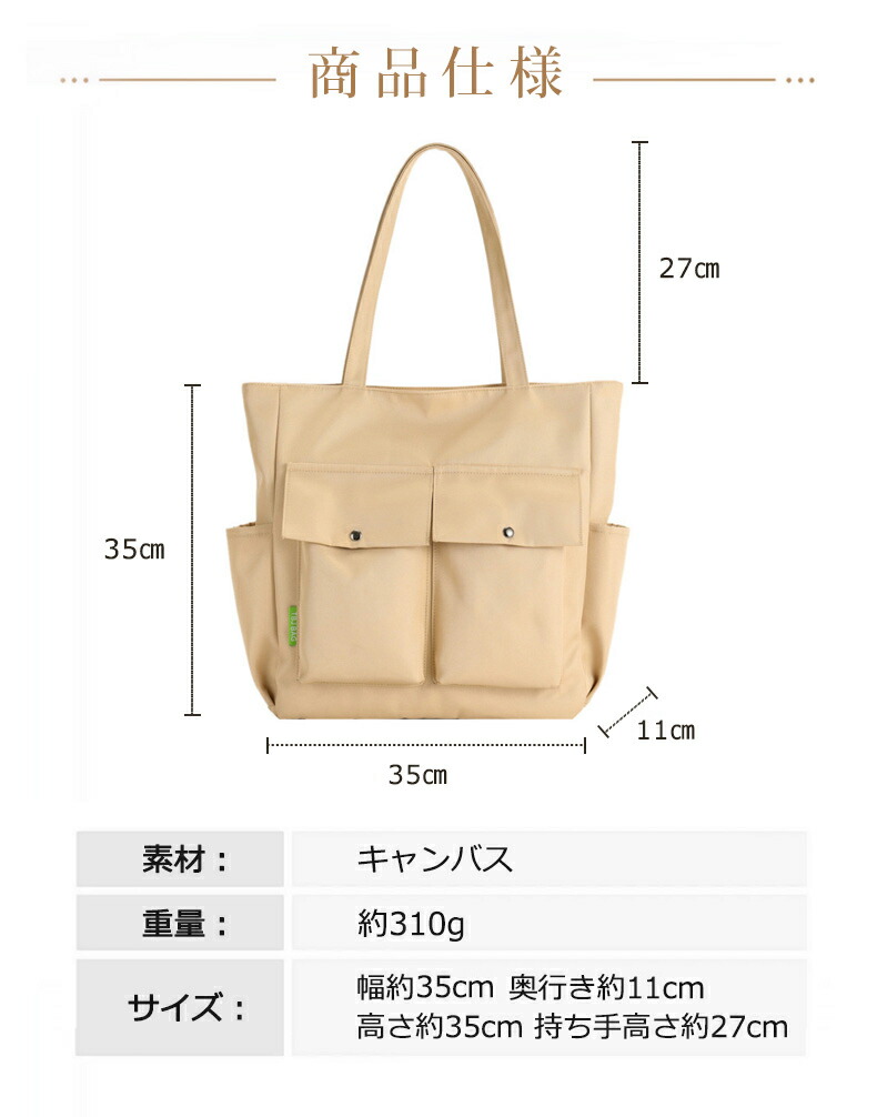 トートバッグ キャンバス ファスナー付き 2way カジュアル 通勤バッグ 無地 自立 帆布 ポケット 6610